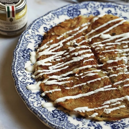 トリュフバターで焼き上げたじゃがいものガレットの仕上げに掛けます。