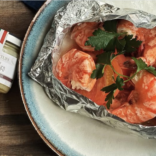 トリュフ香る海老とトマトのホイル蒸し焼き