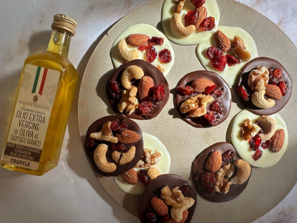 溶かしたチョコレートにトリュフオイルを混ぜ合わせてるので口の中で溶けるごとにトリュフが香ります。