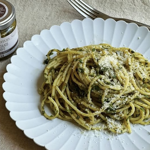 トリュフバジルペーストを使って簡単にジェノベーゼパスタが作れます。