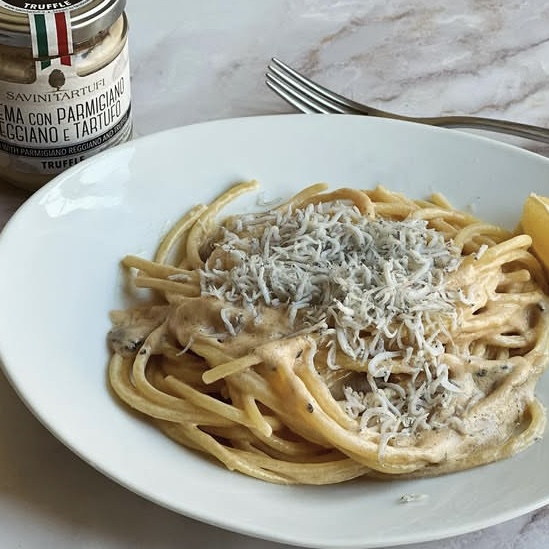 トリュフの入ったパルミジャーノクリームとしらすを合わせたクリームパスタのご紹介