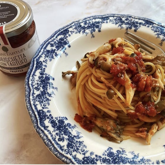 黒トリュフのトマトソースとなるサヴィーニ商品のブルスケッタソースを使って簡単なレシピに。