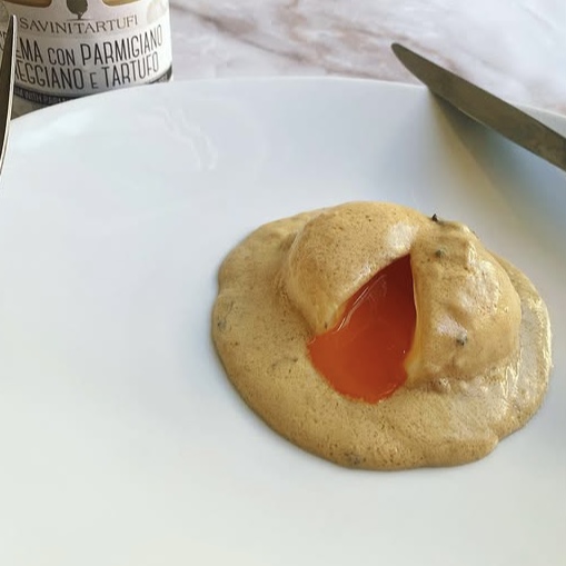 卵を半熟卵にしトリュフ香るパルミジャーノレッジャーノクリームを掛けるだけです。