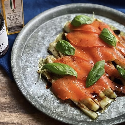 焼き茄子の優しい甘みとねっとりとしたスモークサーモンが合います。