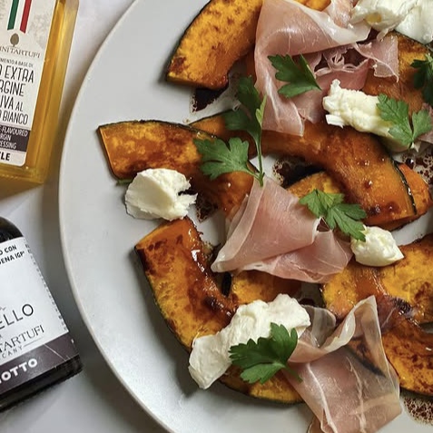 かぼちゃのソテーと生ハムとモッツァレラチーズ トリュフ香るバルサミコ酢と