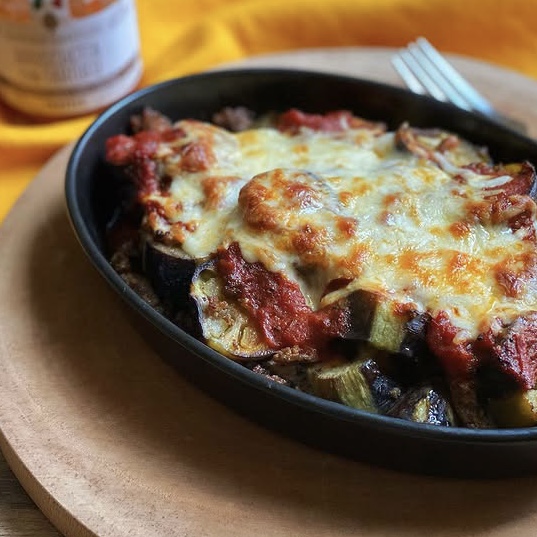 ひき肉と茄子の黒トリュフブルスケッタソースのオーブン焼き