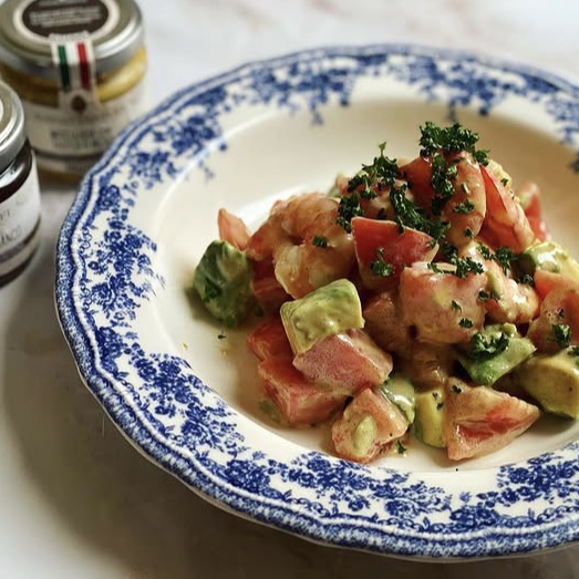 ボウルに海老、トマト、アボカドを入れてハニーマスタードソースを入れて和え、器に盛り付けパセリを少し散らす。