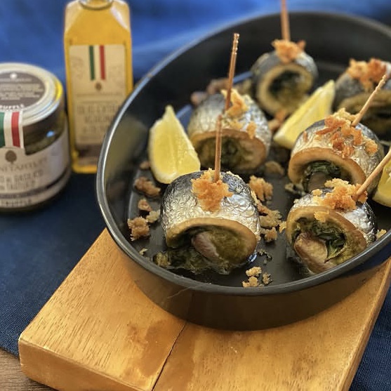 ①のバジルペーストを身全体に塗りつけバジルのはを乗せて巻き上げ楊枝で留める。 - ③耐熱皿に②を並べて①のパン粉を乗せて散らして200度のオーブンで15分焼く。