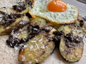 じんわり焼いた茄子にトリュフギャザーソースを合わせました。