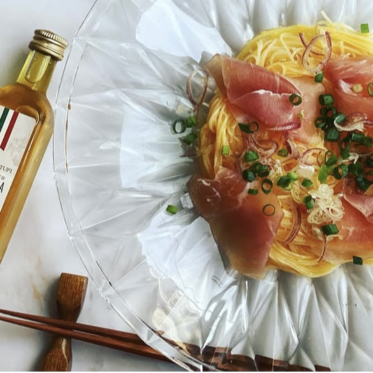 生ハム、卵黄、トリュフオイルを使用したそうめんをカッペリーニのように仕上げた一品です。