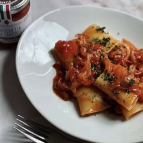 太いもっちりとしたパスタ、パッケリを使った食べ応えのあるトリュフ香る一品のご紹介。
