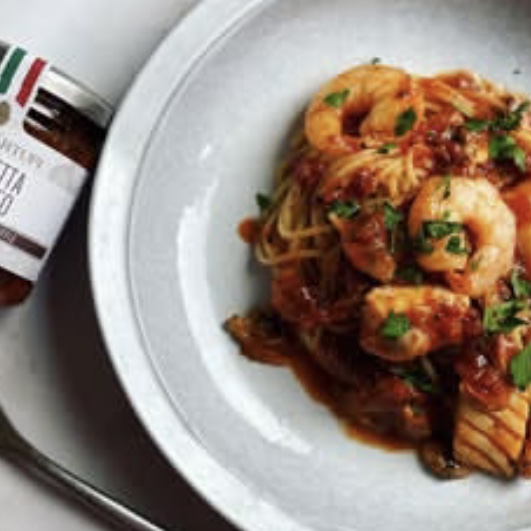 黒トリュフブルスケッタソースで作るペスカトーレのご紹介。
