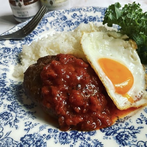 市販のハンバーグ、目玉焼き、炊いたご飯があれば豪華なランチプレートが作れます。