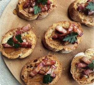 ピーナッツバターとベーコン、トリュフ蜂蜜のクロスティーニ